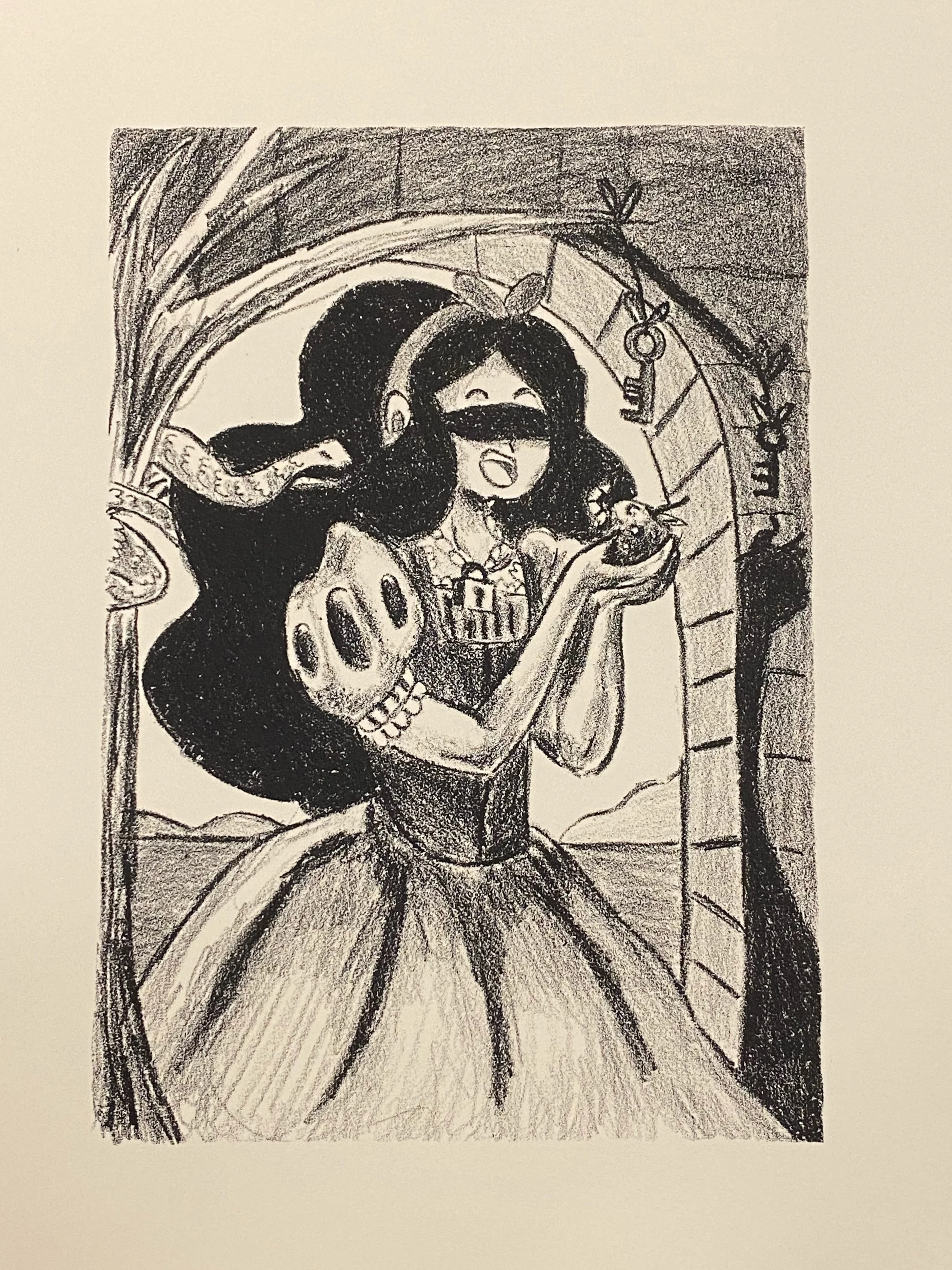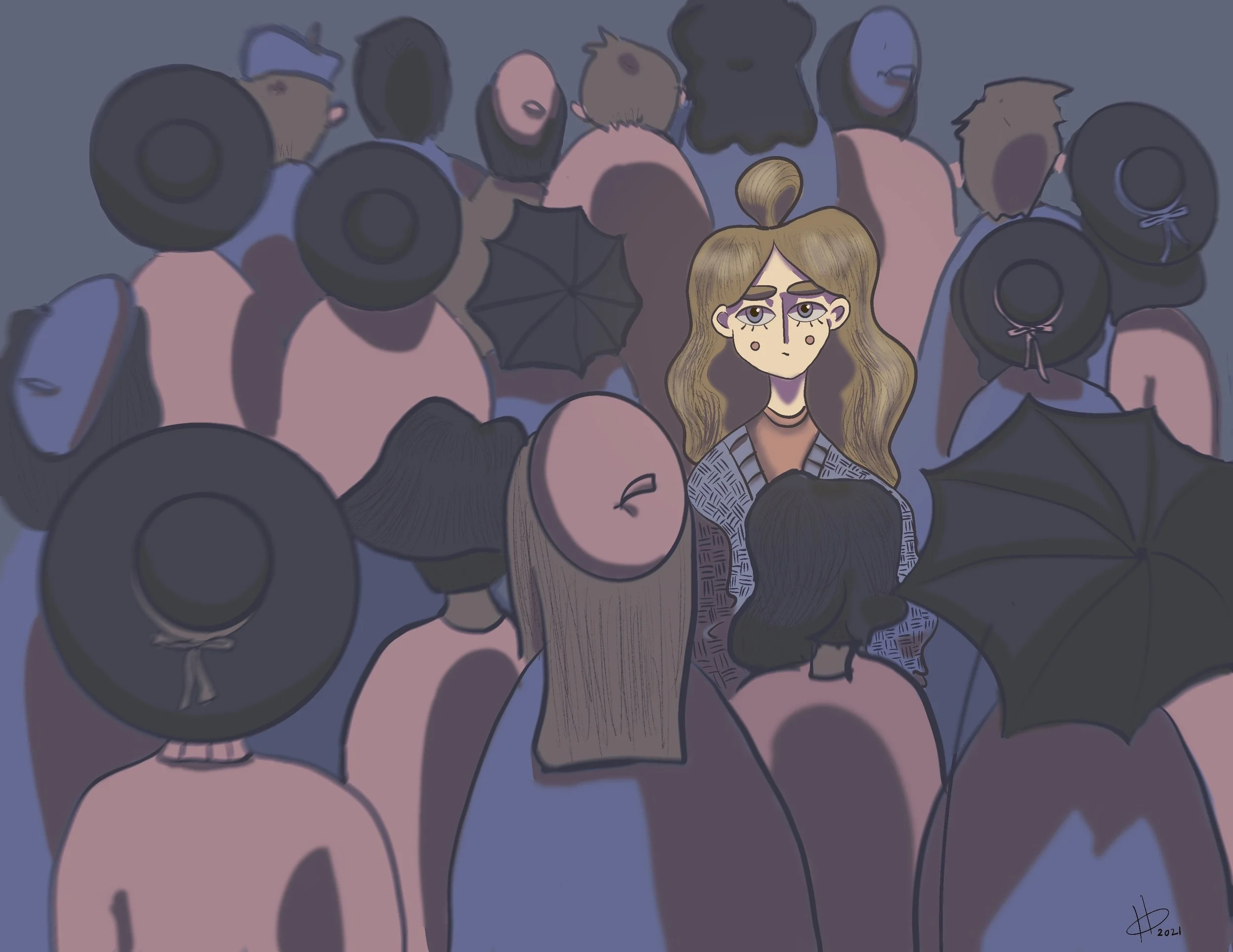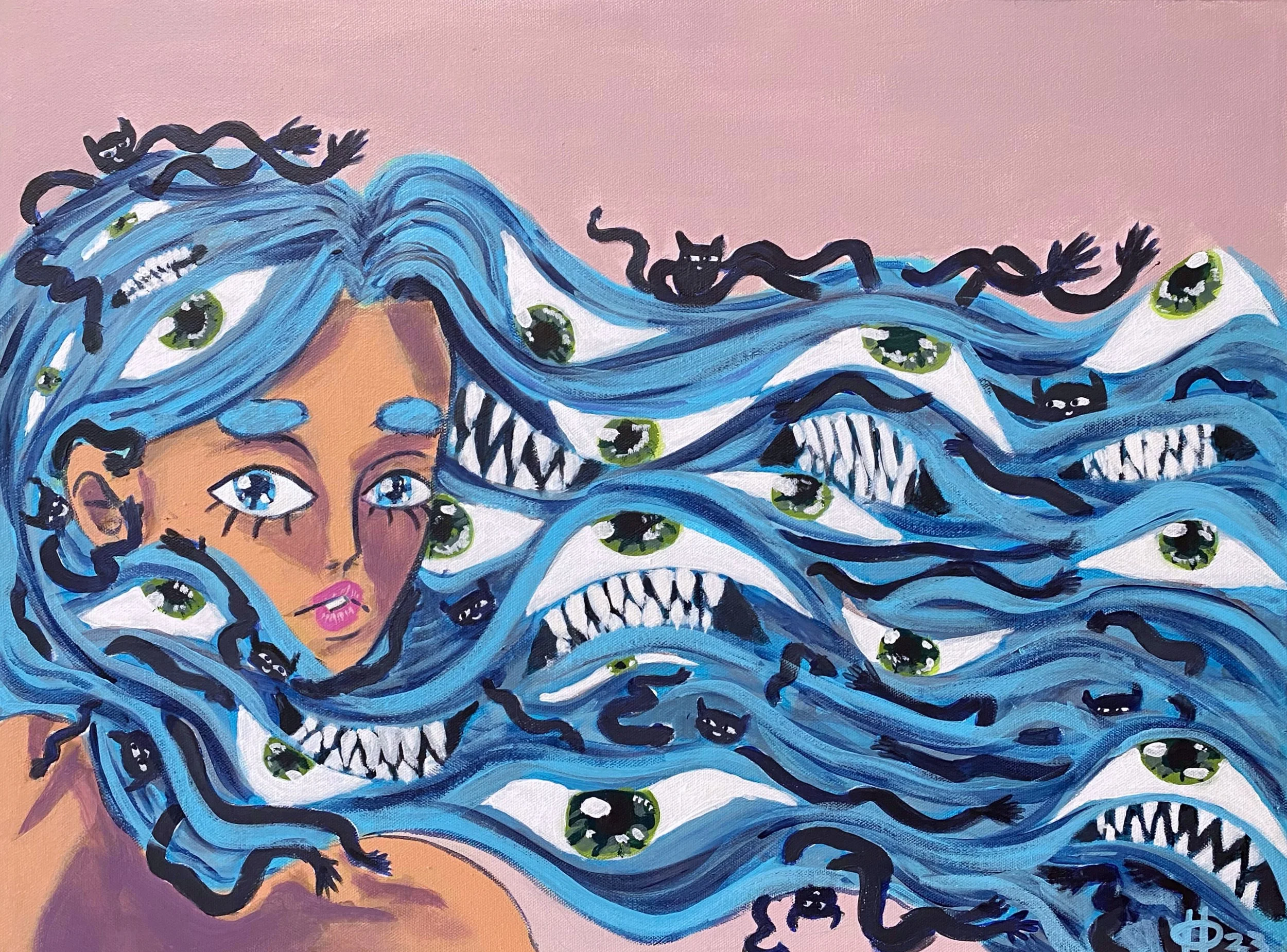Inspired by my childhood shows, recent works have established an illustrative style reminiscent of the cartoon culture of the late 90s and early 2000s, including the genre of Anime. My style is a mix of cute and horror, utilizing simple iconic character designs, high contrast, bright colors, bold outlines, simplified features, and great big eyes. Using an invented vocabulary of symbolism, the work has an almost childlike quality but with dark undertones as it explores themes of isolation, fear, guilt, judgment, and vulnerability.