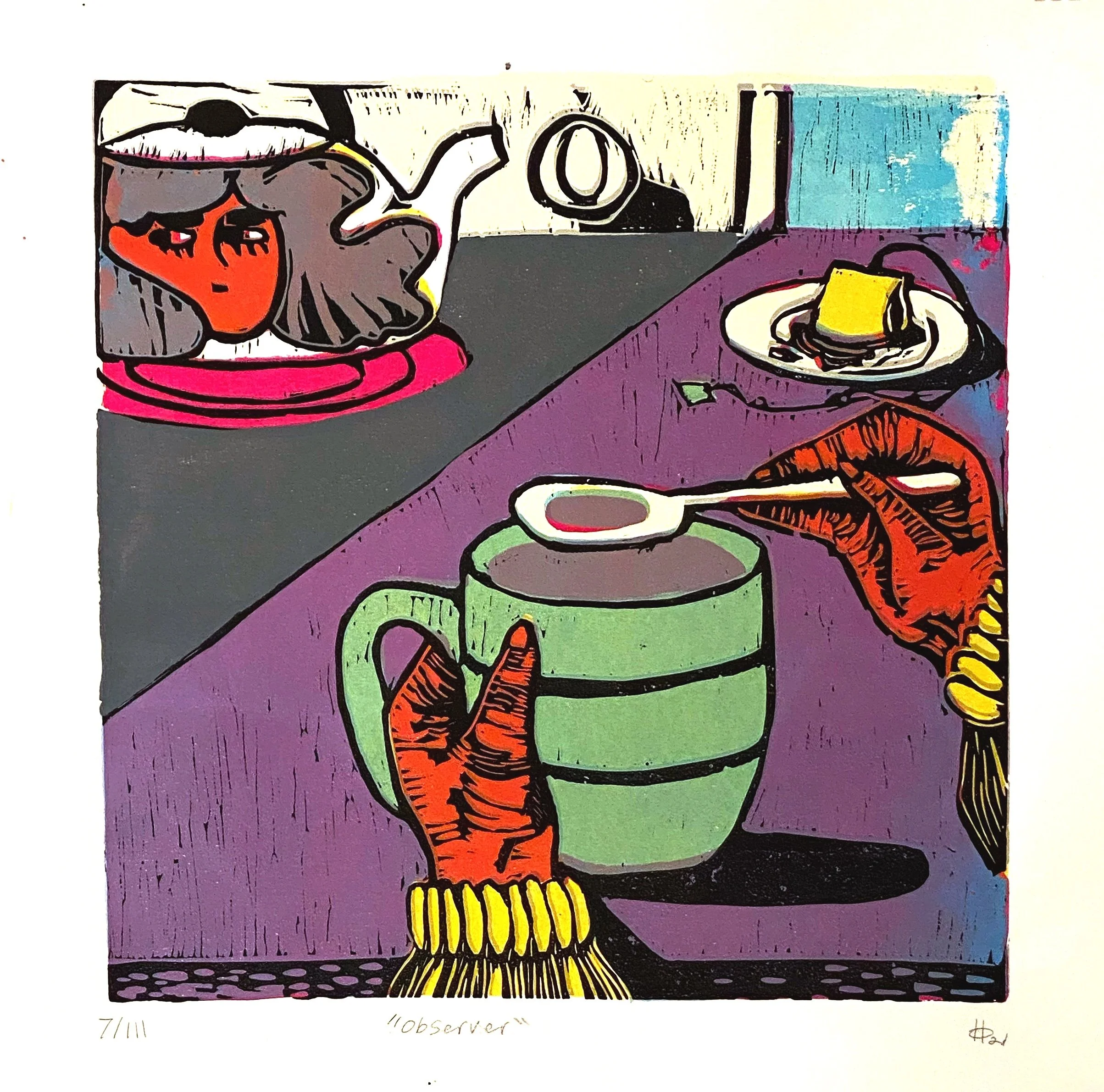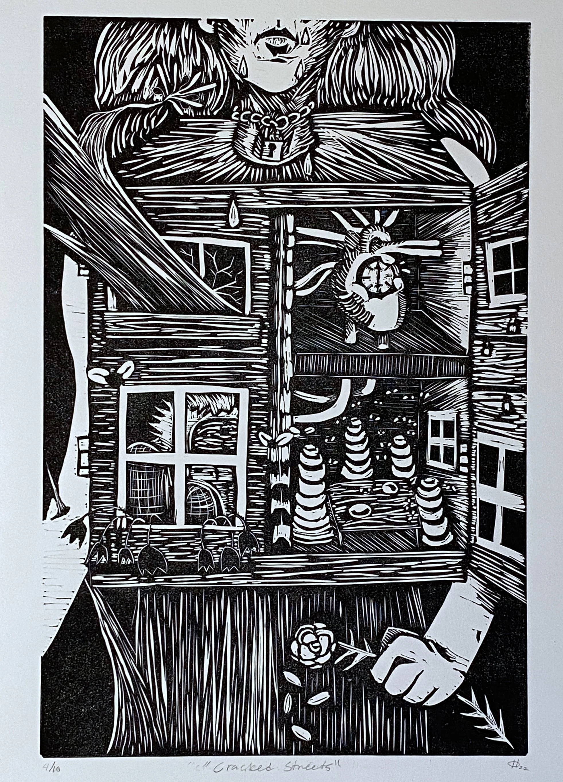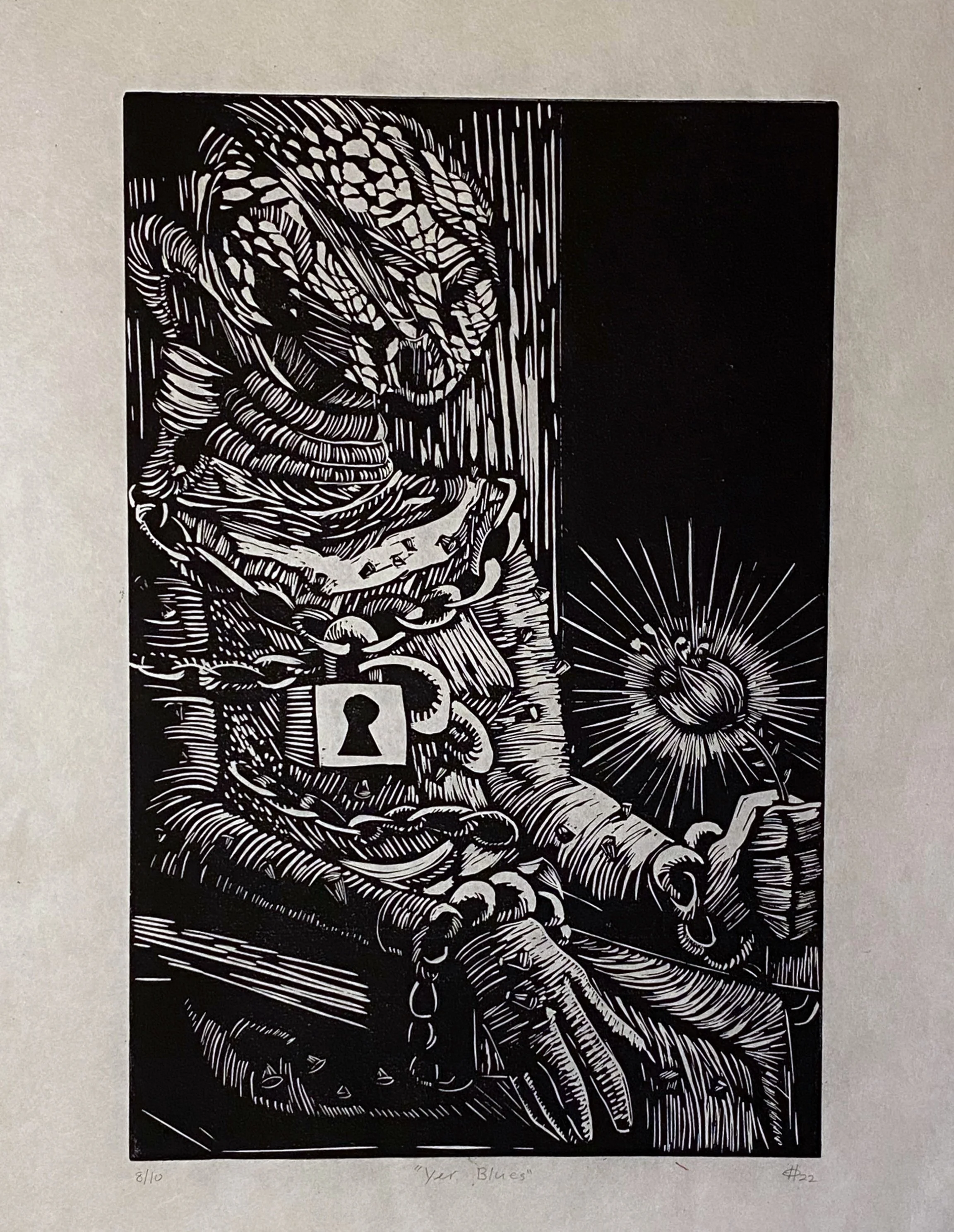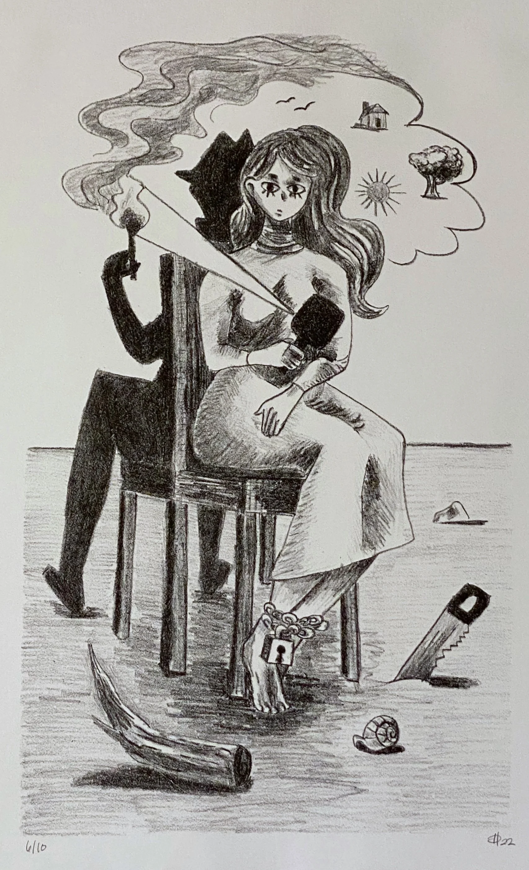 Inspired by my childhood shows, recent works have established an illustrative style reminiscent of the cartoon culture of the late 90s and early 2000s, including the genre of Anime. My style is a mix of cute and horror, utilizing simple iconic character designs, high contrast, bright colors, bold outlines, simplified features, and great big eyes. Using an invented vocabulary of symbolism, the work has an almost childlike quality but with dark undertones as it explores themes of isolation, fear, guilt, judgment, and vulnerability.